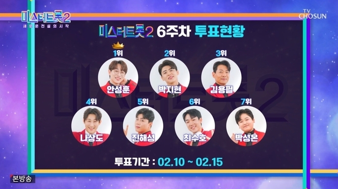 트로트로 큰 인기를 끌었던 티비조선에서 미스터트롯2 투표방법을 안내 합니다. 임영웅이라는 차세대 스타를 탄생시킨 오디션 프로그램의 후속작 입니다. 미스터트롯2 국민투표로 참가자 응원하기로 마음 먹었다면 해야 합니다. 우리 손으로 우승자를 만들 수 있습니다. 미스터트롯2 투표 하는 방법을 설명드립니다. 2023년 2월 23일부터 미스터트롯2 8주차 투표기간이 시작 됐습니다. 7주차 투표순위 결과는 다음과 같습니다.